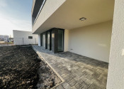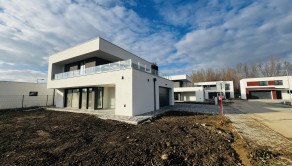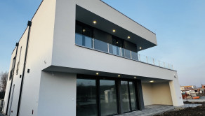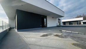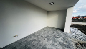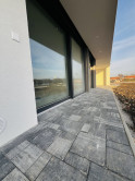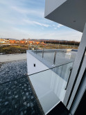 ↘ Nadštandardné vybavenie holodomu: exteriérové zábradlie terasy ako aj okien riešené pomocou sklených tabúľ uchytené o antikorové stĺpy, exteriérové svietidlá, vnútorné vypínače a zásuvky, dizajnová zámková dlažba v exteriéry – spevnené plochy spodnej terasy tiež parkovacích státí, deliace ploty